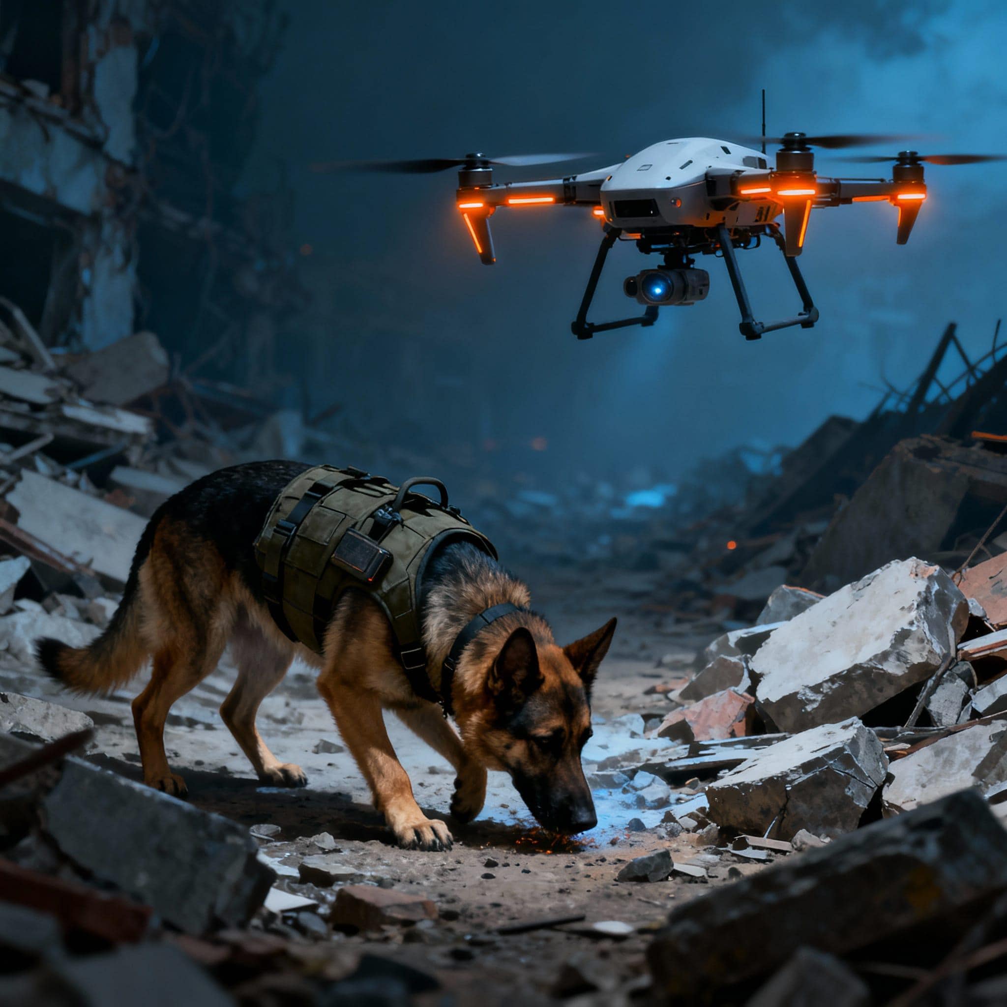 drone, dog german shepherd, rescue mission, landscape, digital download