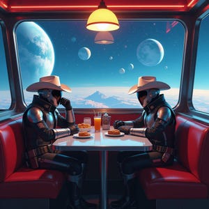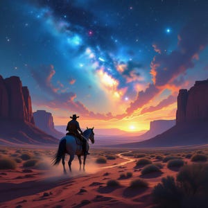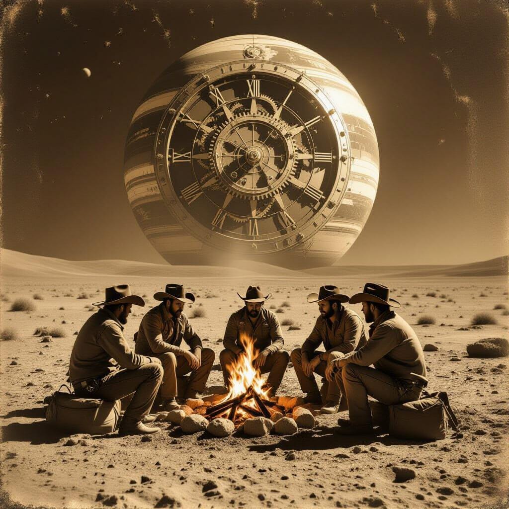cowboys, campfire, desolate moon, clockwork planetarium, landscape, digital download