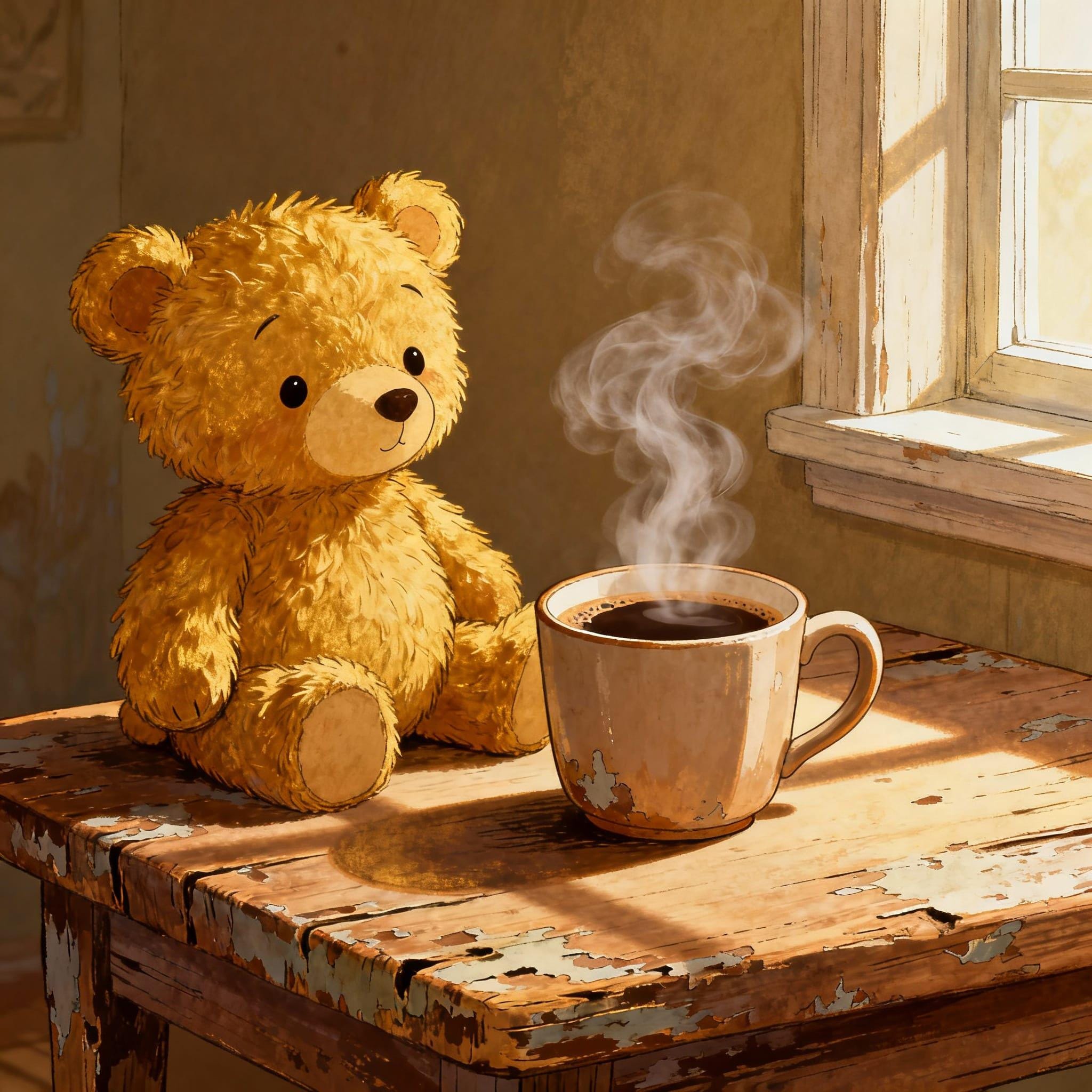 A sweet cozy scene for your space. This digital download shows a golden-brown cute teddy bear sitting beside a steaming cup of coffee in soft window light. Inspired by the warm, illustrative style of Beatrix Potter and Mary Blair, it adds comfort and nostalgic charm to any space. Download, print, and enjoy:)