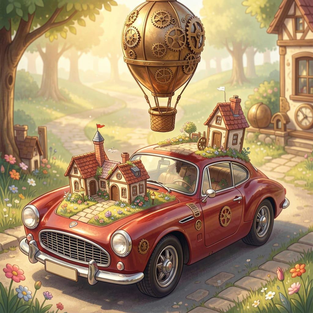 spring, vintage sports car, hot air balloon, fantasy, miniature spring scene, digital download