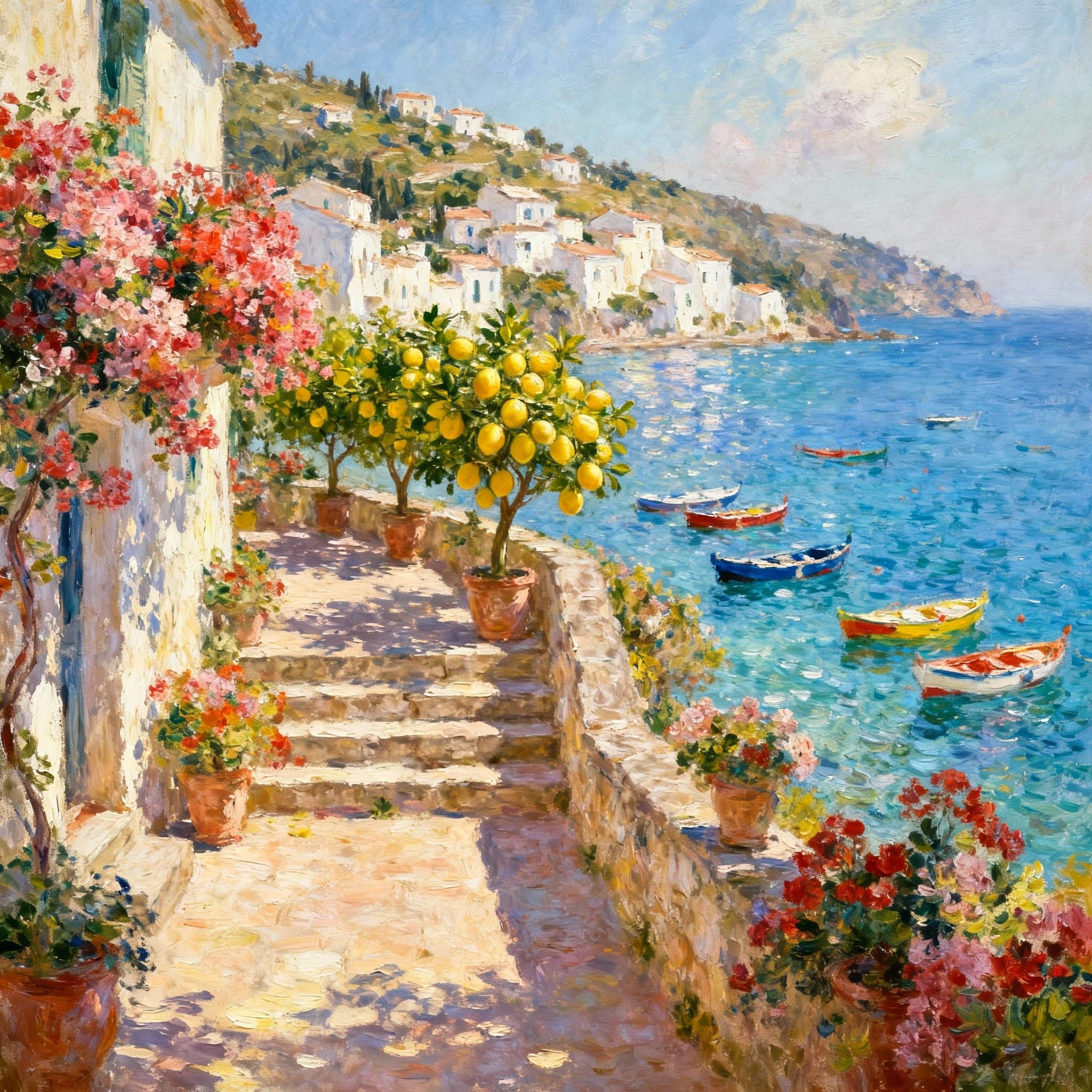 mediterranean village, sea, landscape, warm lighting, digital download