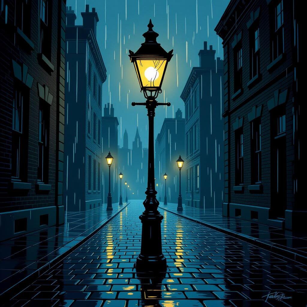 streetlamp, rain, cobblestone street, landscape, noir cityscapes, digital download