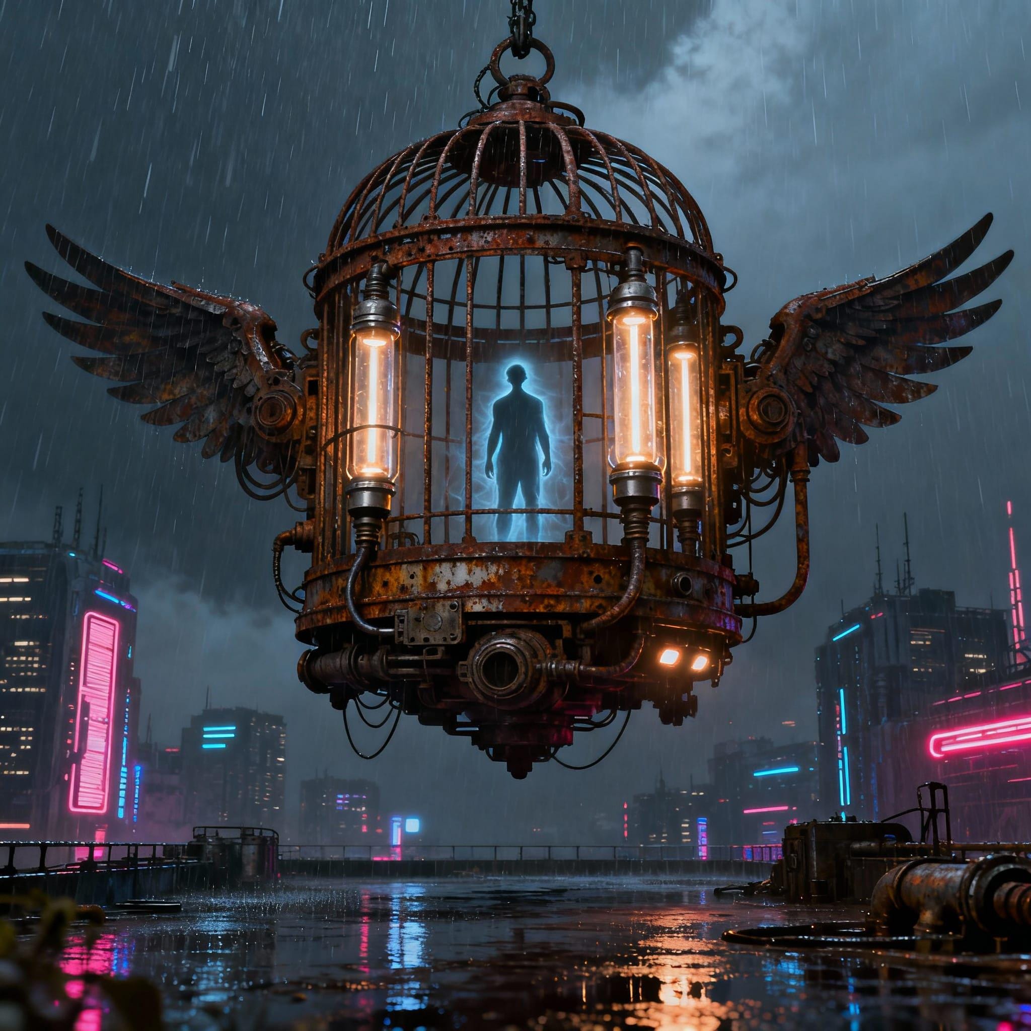 mechanical birdcage, cyberpunk cityscape, surreal, bird, digital download
