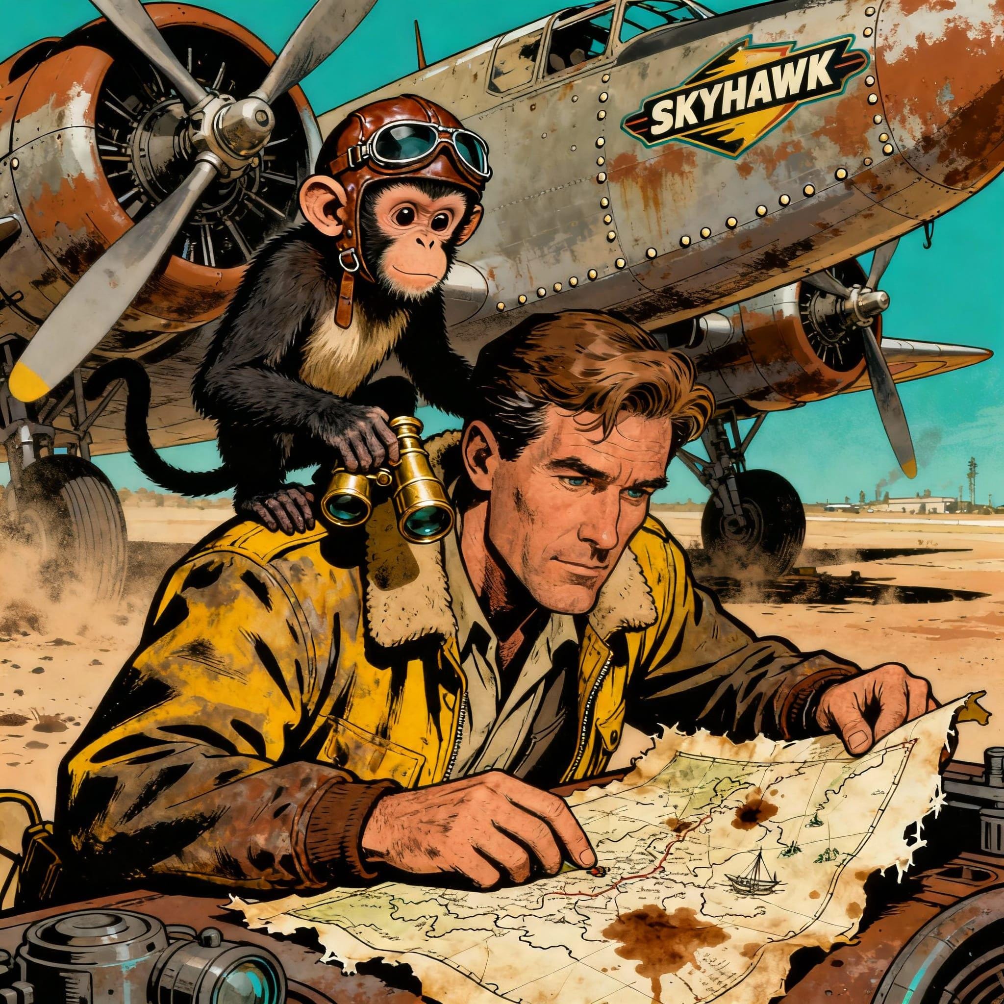 capuchin monkey, aviator helmet, bush pilot, propeller plane, airplane, landscape, digital download