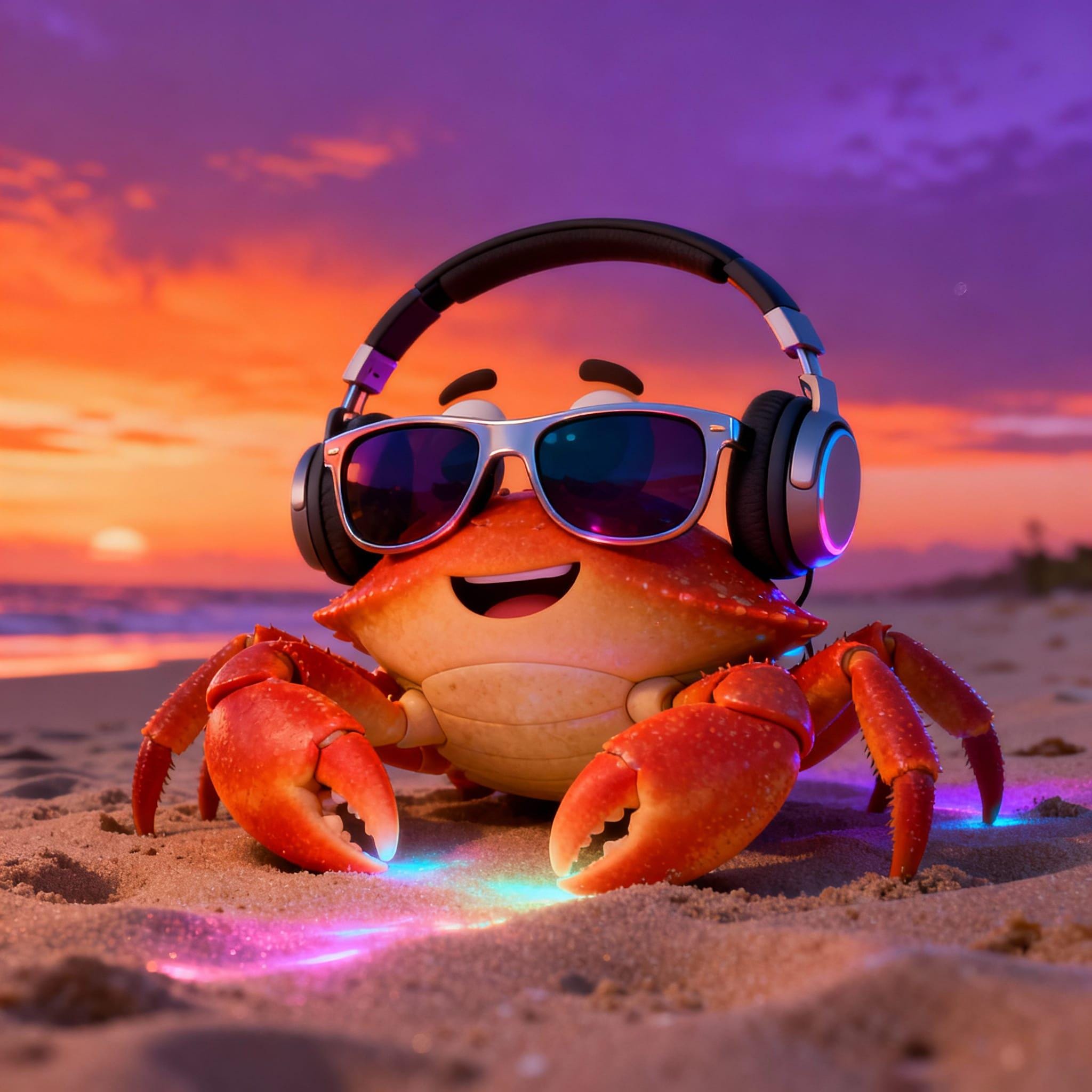 funny crab, sunglasses, headphone, beach, twilight, landscape, crabs, digital download