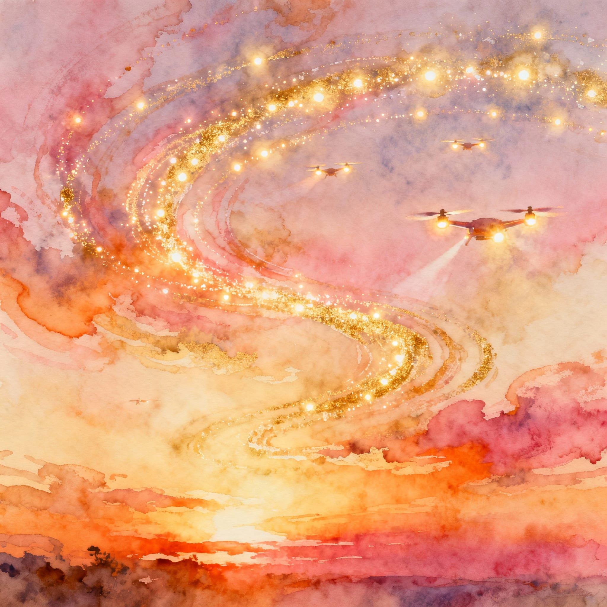 drone display, golden hour, sunset, landscape, watercolor, digital download