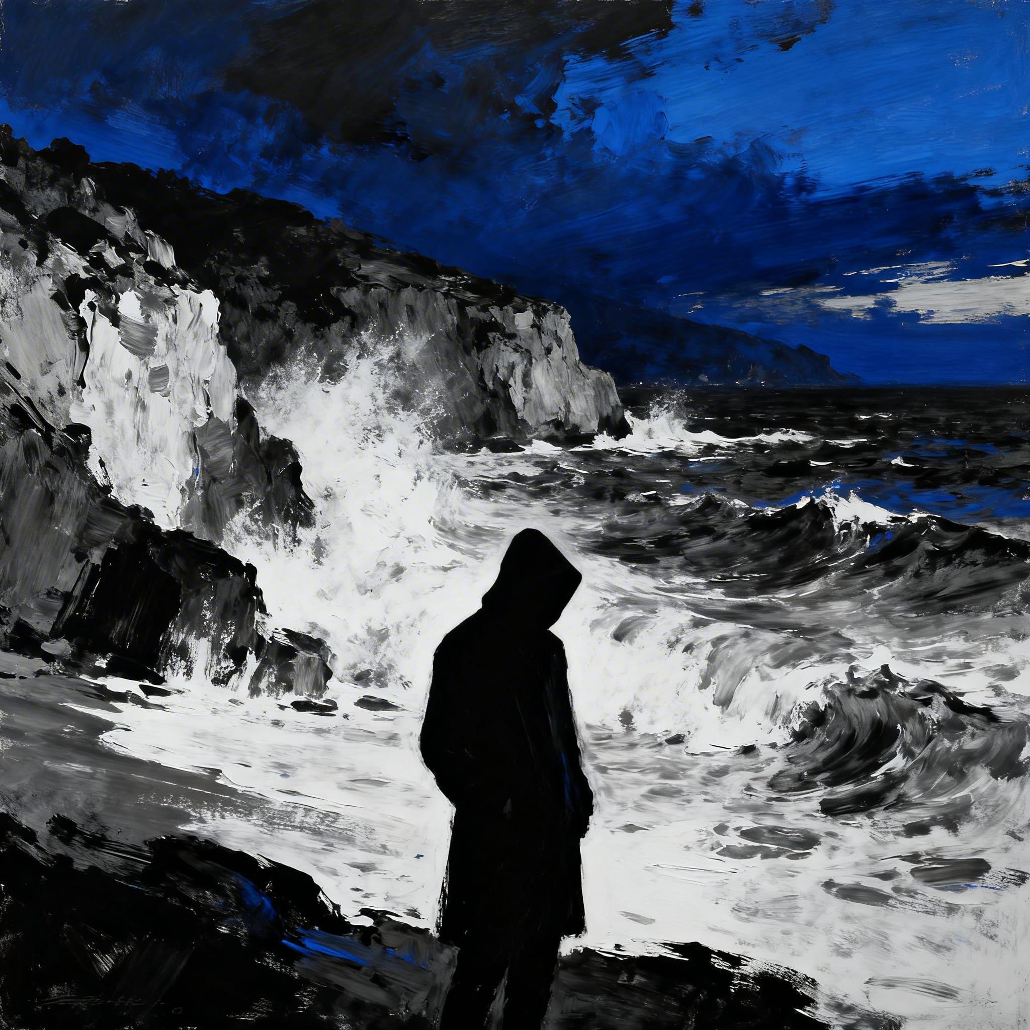 mediterranean seaside, dusk, waves, cliffs, landscape, hooded figures, digital download