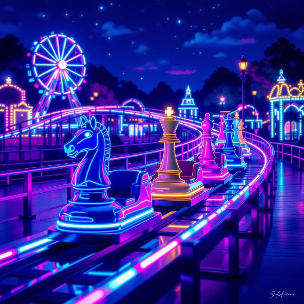 neon, roller coaster, amusement park, midnight, things shaped like chess pieces, digital download