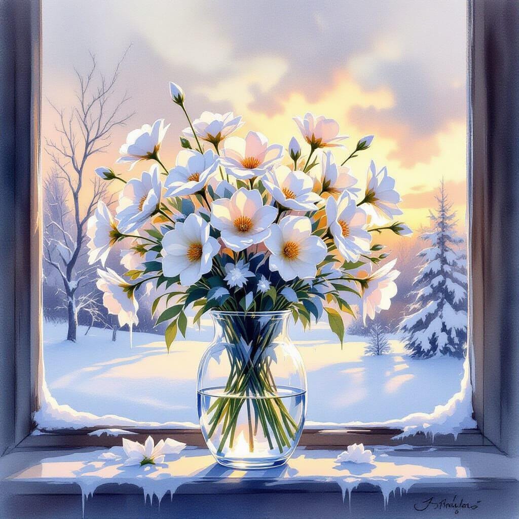 ice frost, bouquet, glass vase, windowsill, winter, flowers , digital download