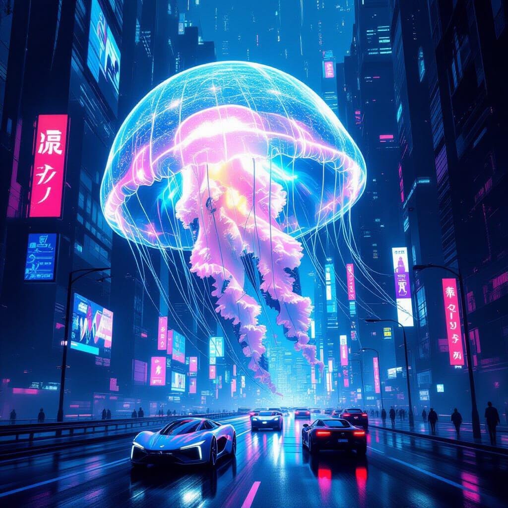 futuristic metropolis, jellyfish, neon, surreal, digital download