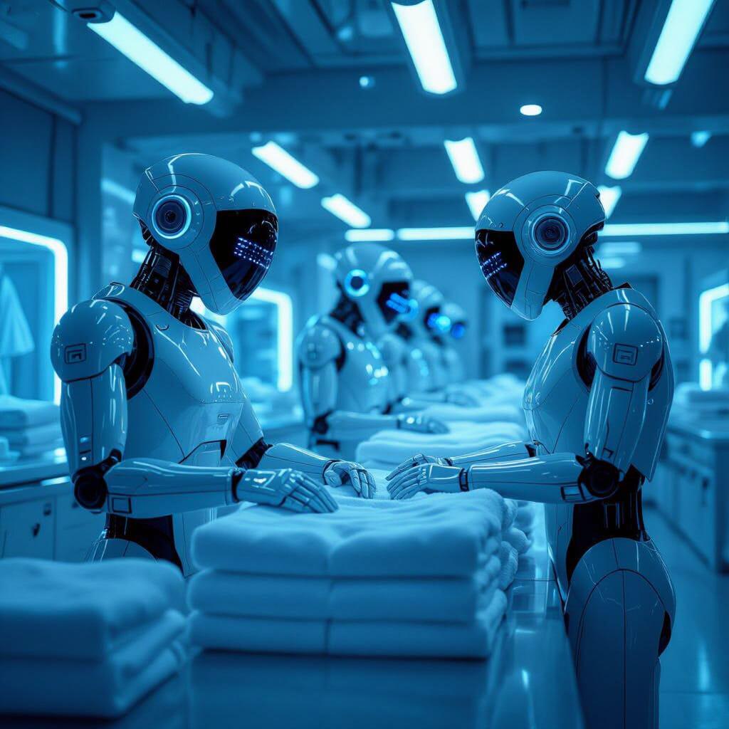 automatons, laundry factory, hotel towels, sci-fi, digital download