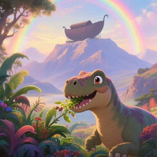 dinosaur, ark, mountains of ararat, rainbow, landscape, prehistoric activities, digital download