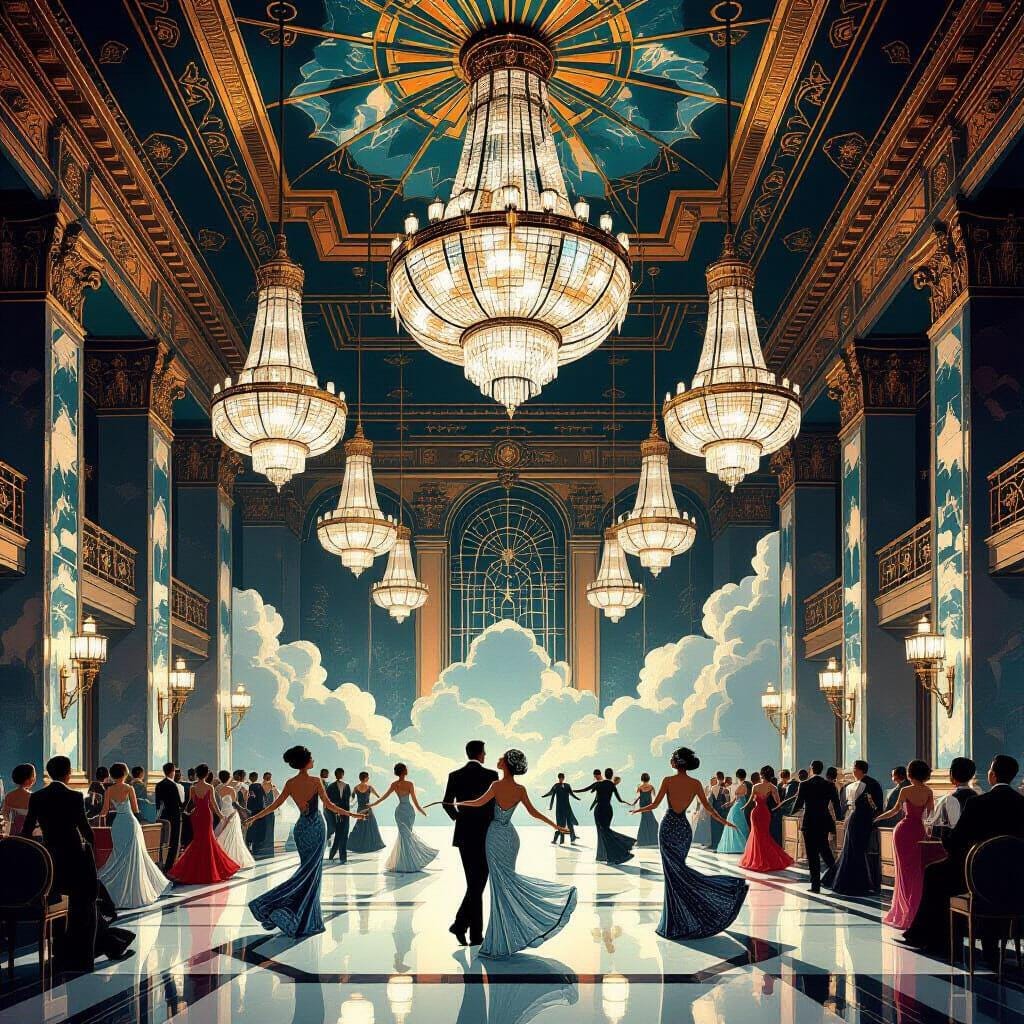 art deco ballroom, clouds, surreal, music festivals in another reality, digital download