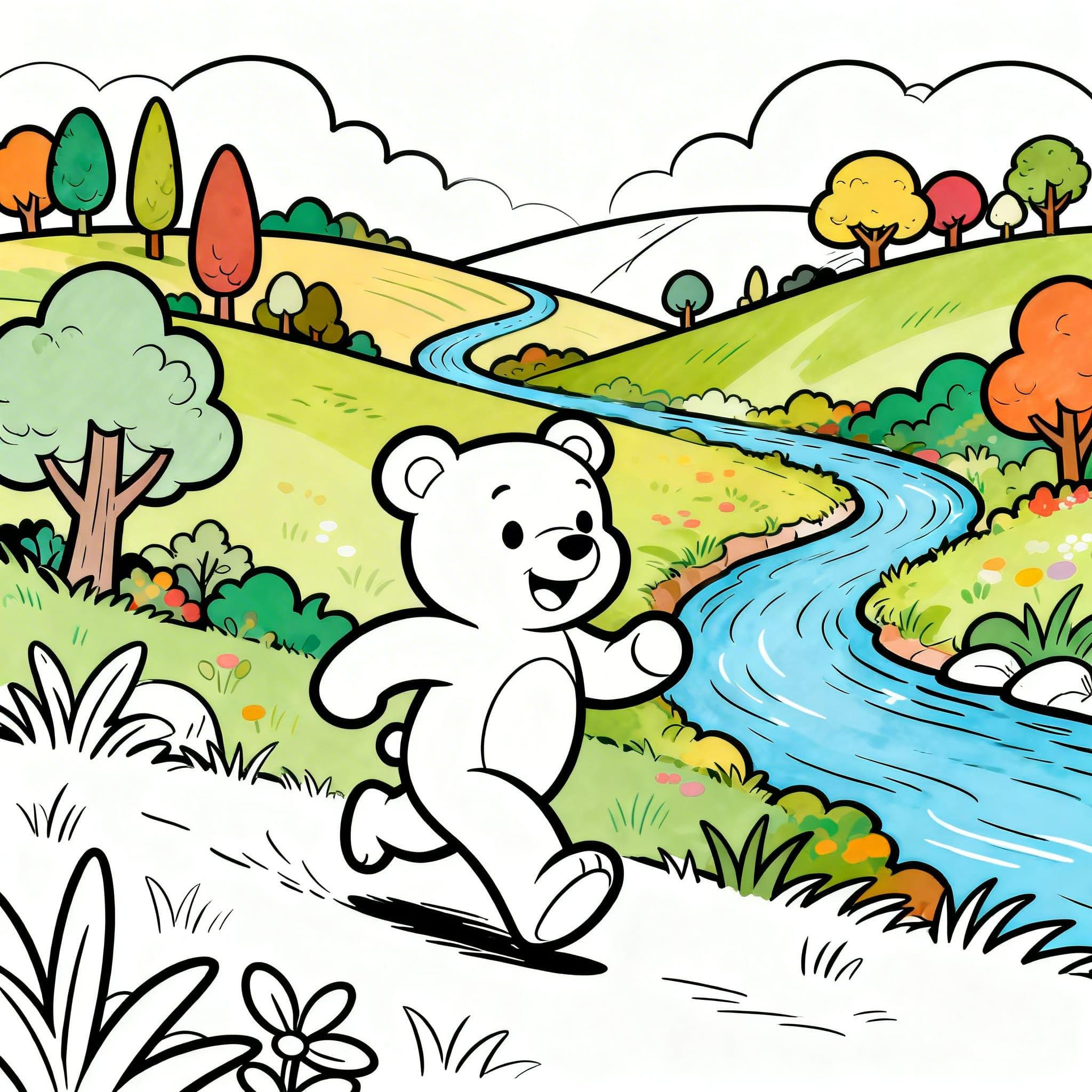 teddy bear running, nature, hills, trees, river, coloring pages, digital download